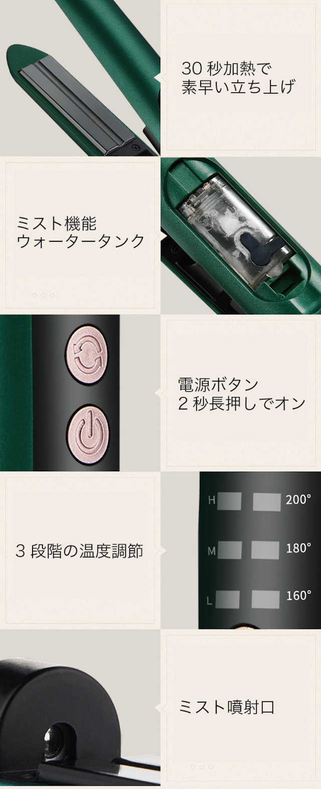 - 素早い30秒立ち上げ!ミストが髪に潤いを与えるので、熱による髪へのダメージをケア!