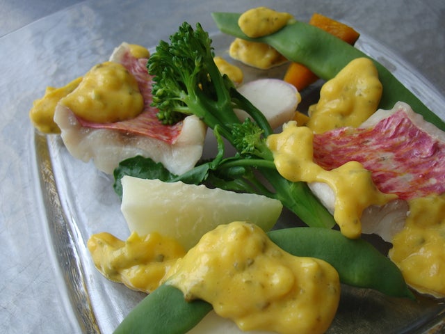 <日本海産鮮魚のスチーム 地元野菜と共に ベアルネーズソースで>