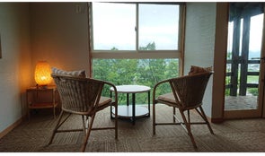 シンプルに設えた空間で、ゆっくりお過ごし下さい。バスルームも広めです。何よりは、窓からの景色!小高い山の中腹にあり、平地から見る景色とは、断然違います。(全館禁煙)