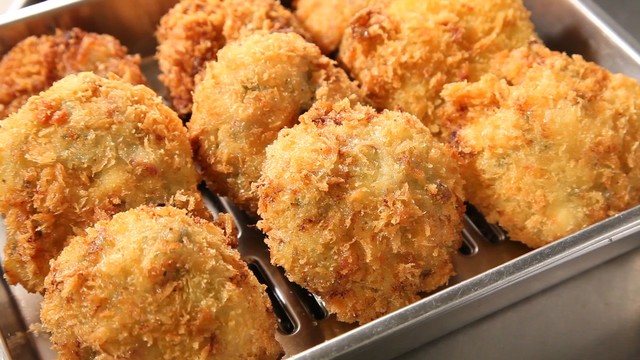 食材を細かく刻み、煮込んで一度もつ鍋を完成させた後、更に手間暇かけて特別な手順をふんでコロッケにしています。