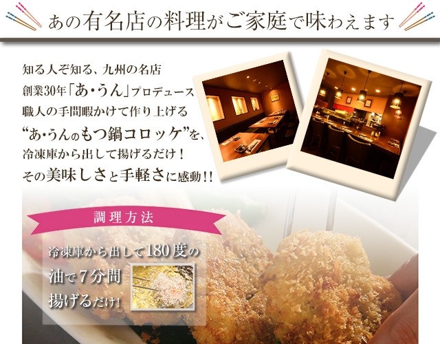 知る人ぞ知る、九州の名店「あ・うんグループ」プロデュースの職人が手間暇かけて作り上げた『あうんのもつ鍋コロッケ』は、冷凍庫から出して180℃の油で7分間、そのまま揚げるだけで本場の味が楽しめ、その手軽さと美味しさに感動します。