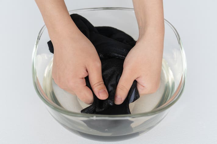 ① 水がきれいになるまで、3〜4回やさしく揉み洗いしてください。ぬるま湯で30分程度つけ置きすると汚れが落ちやすくなります。
