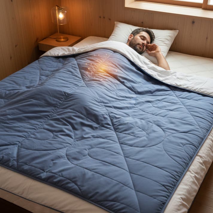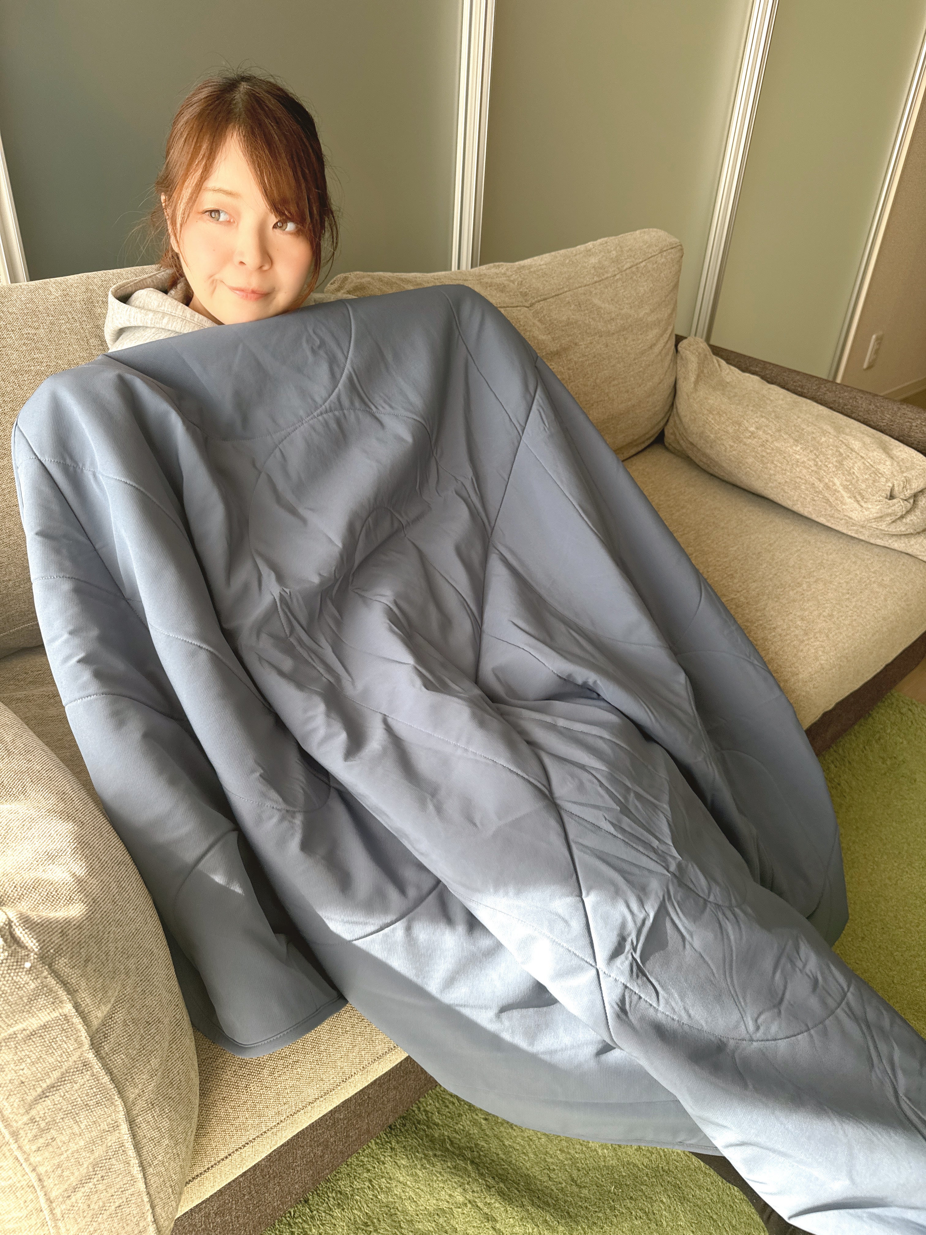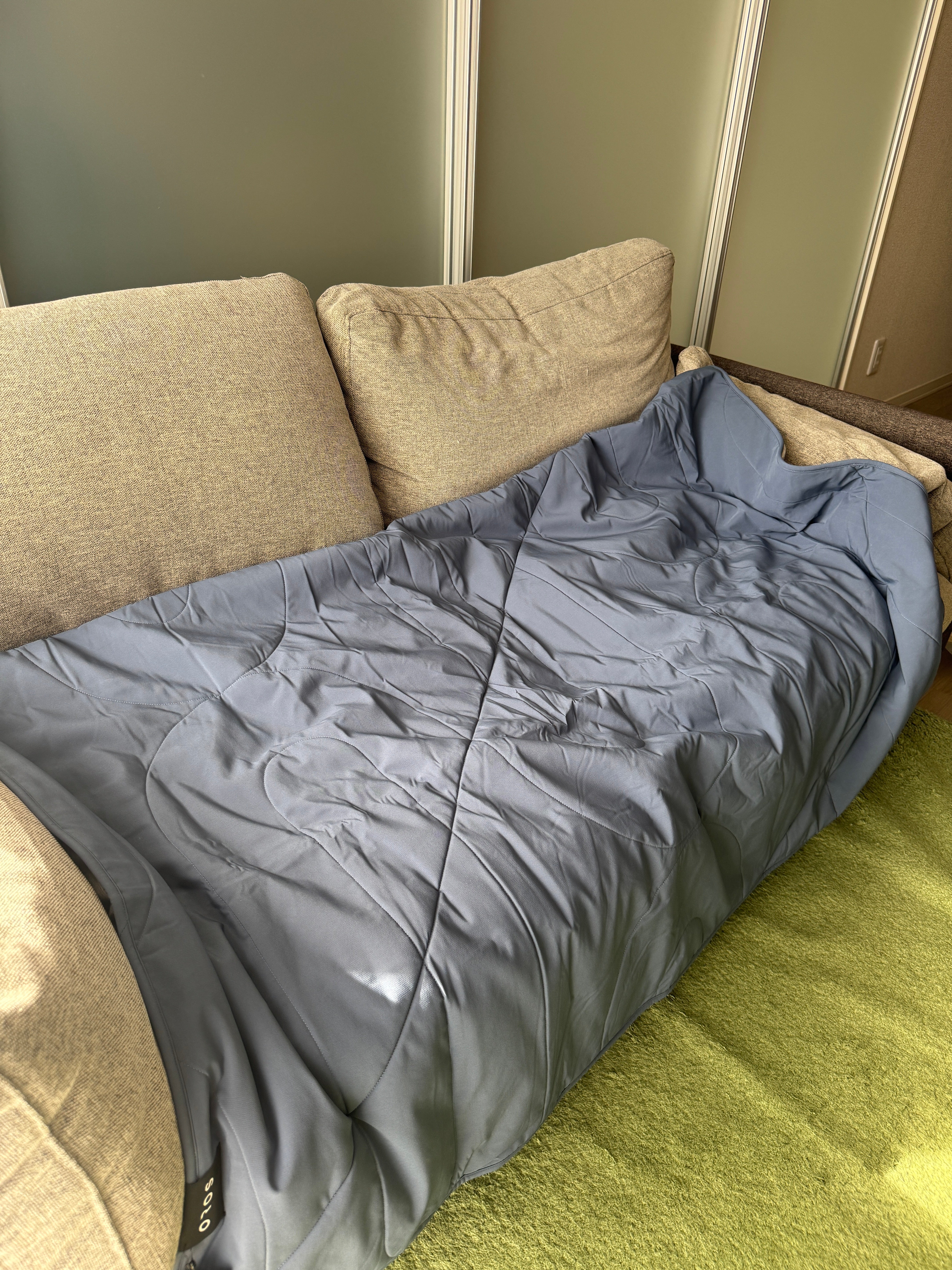 提案: 50x60インチは日本のシングルマットレス(幅約100cm)に対して、左右に約25cmずつ垂れる、理想的な「オーバーレイヤー」サイズです。既存の羽毛布団の上に掛ければ、外部の冷気を遮断するシールドに。下に敷けば、身体の重みで潰れない断熱層(アンダーキルト)として機能し、背中からの底冷えを充分にシャットアウトします。