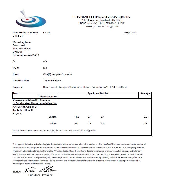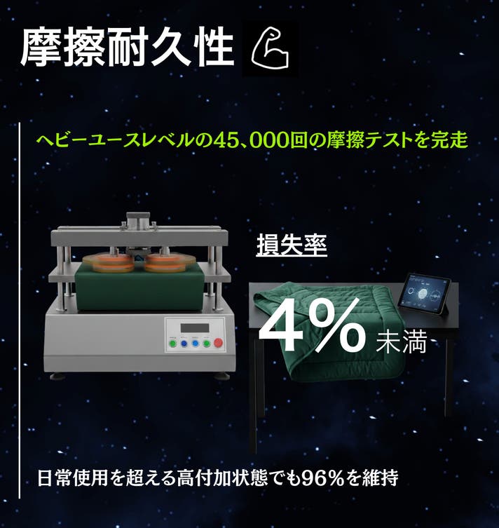 洗濯による収縮率は-2.2%(業界基準±3%)、 45,000回の摩耗試験でも96%以上の質量を保持。