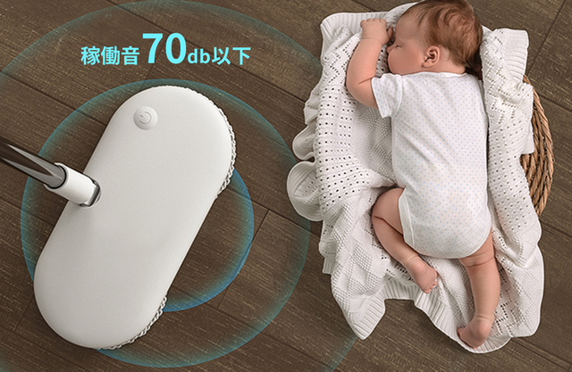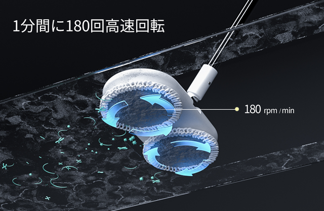 - 2枚のモップパッドが1分間に180回高速回転してしっかり清潔!