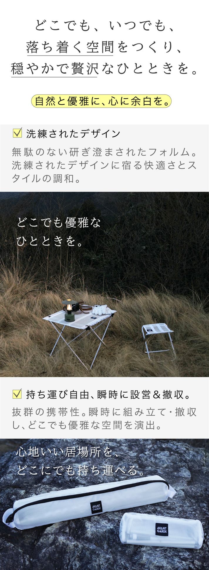 私たちは、探索的で実験的なデザインコンセプトでアウトドアの未来に挑んでいます。AVANT GARDE は、自然の中での非日常、そして日常での暮らし・働き・旅するなど、境界のない多様なシーンを自由に楽しむための高品質で創造的な製品を追い求め、日々開発を続けています。