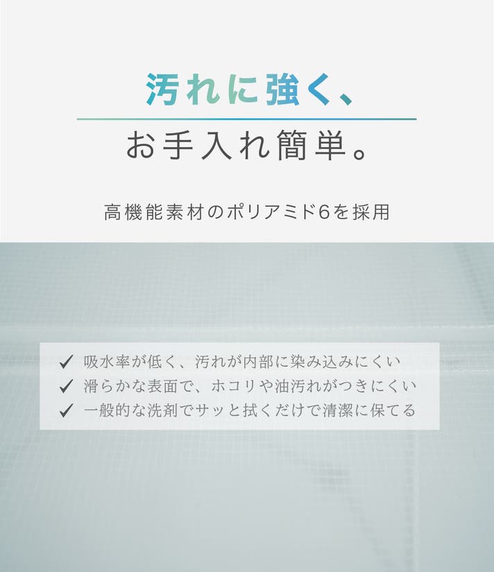 A1: ポリアミド6(PA6)を採用しており、汚れが付きにくく、付いた汚れも簡単に落とせるのが特徴です。