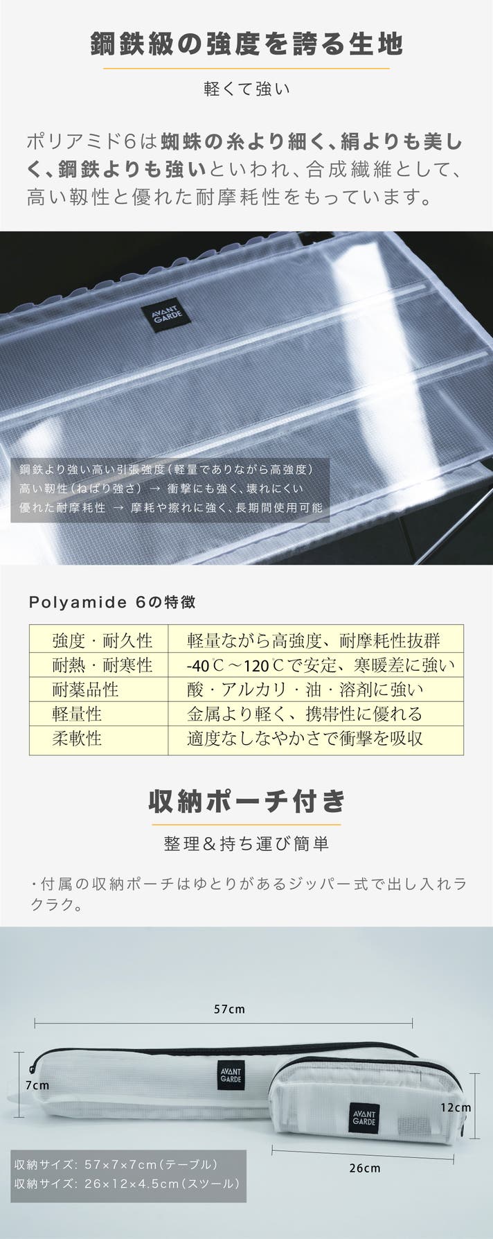 A3: スツールの耐荷重は約75kg、テーブルの耐荷重は約15kgとなっております。安定性を保ちつつ、軽量設計を実現しています。