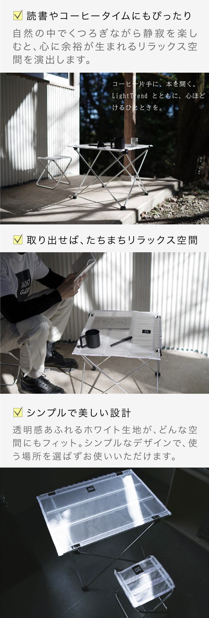 A7: はい、LightTrendのテーブル&スツールは、アウトドアだけでなく、自宅のベランダや室内でも快適に使用できます。