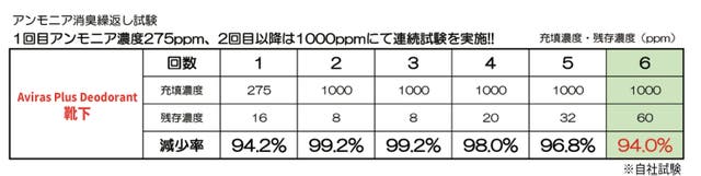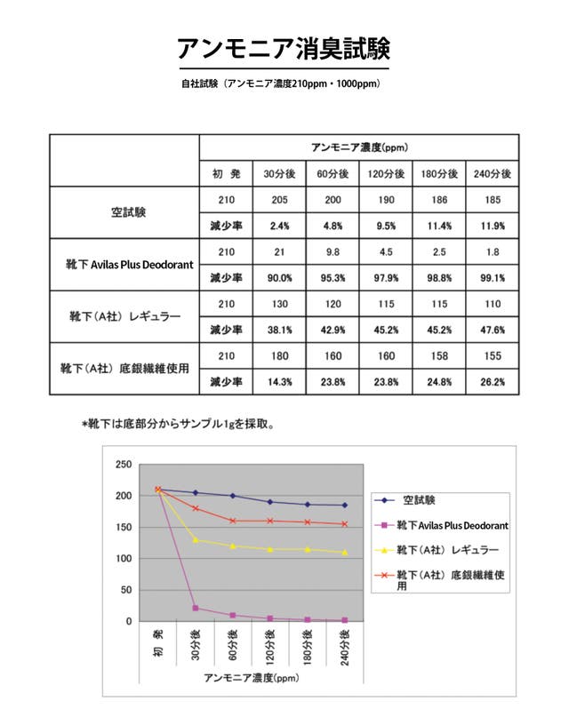 ※汗臭の元であるアンモニアと靴下を密閉容器に入れた際のアンモニア残存濃度試験。