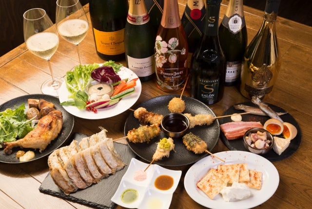 「泡包オリジナル餃子」以外にも、「名物フォアグラのデニッシュ」をはじめとした「フレンチお惣菜各種」、「12種の自家製燻製」、メインの「鶏肉のコンフィ」、「名物ローストビーフ」「創作串揚げ(和牛串揚げフォアグラ乗せ、モッツァレラとフルーツトマトの串揚げ等)」など”シャンパン”にあうお料理をご用意しています。