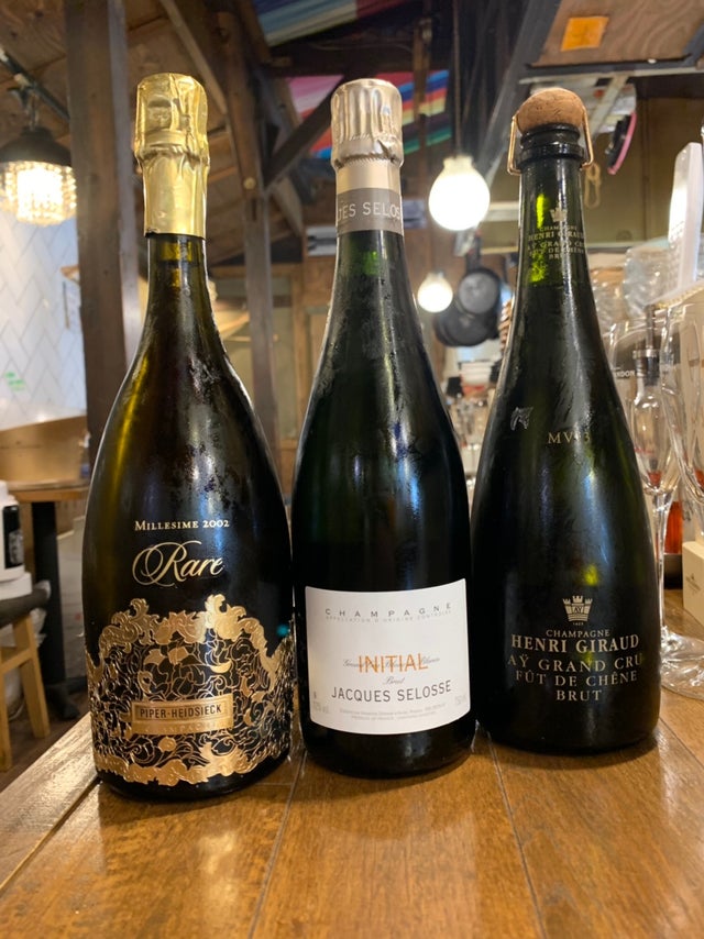 中)『ジャック・セロス、ブリュット・イニシャル・ブラン・ド・ブラン(34,800円、税別)』。世界最高峰の レコルタン・マニピュラン(RM:葡萄生産者元詰めシャンパーニュメーカー)。