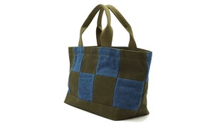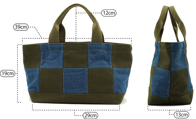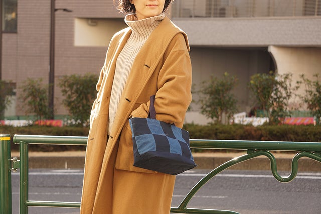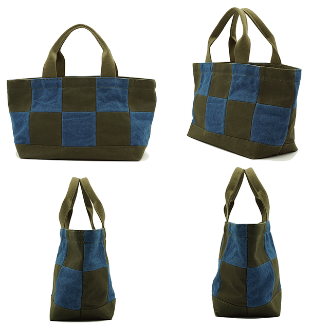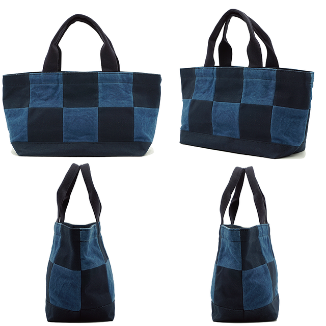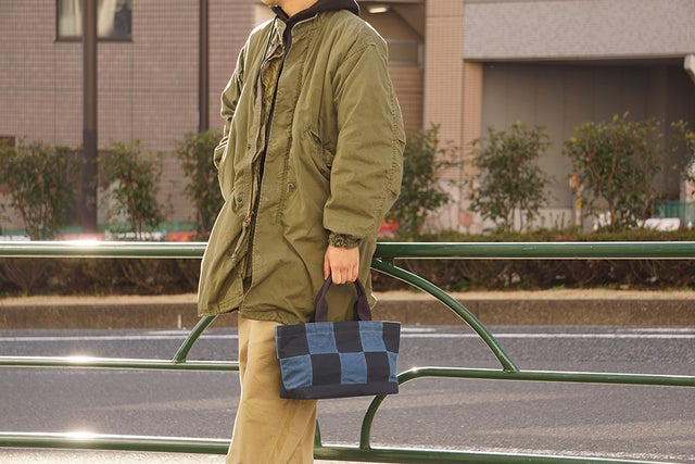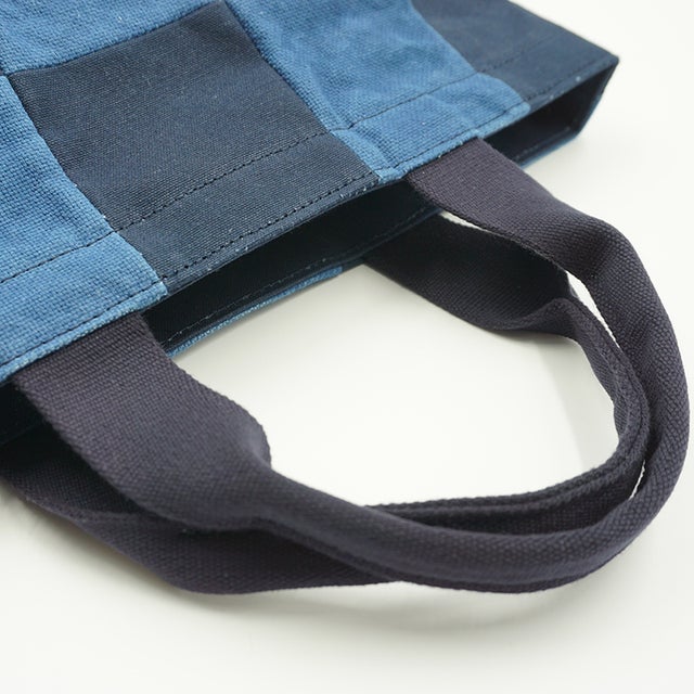 Hill's Side House定番のパラフィン帆布と藍染め生地を市松柄にデザインしたミニトートバッグ。スマートフォンやキャッシュレス化により持ち物がどんどん減っている昨今だからこそのバッグです。