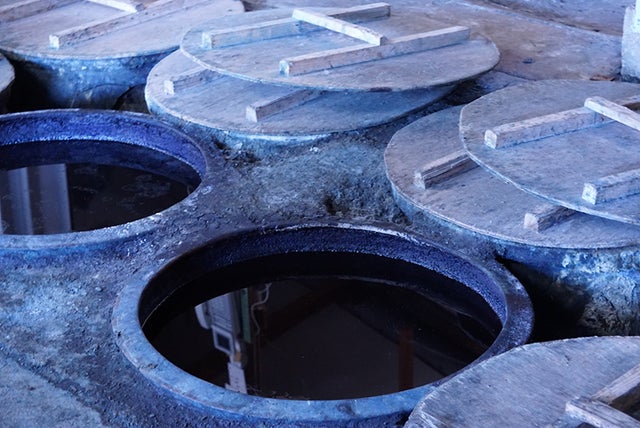 この発酵を促す打ち水は、消毒した水道水では駄目だと言います。また、浅い井戸は塩気があって使えないので地下80m下の地下水をポンプで汲み上げて使います。これは、染工所でも同じで作業場では年中新鮮な水が流れ続けます。豊富な水源があるこの土地だからこそ生み出せる藍色なのです。