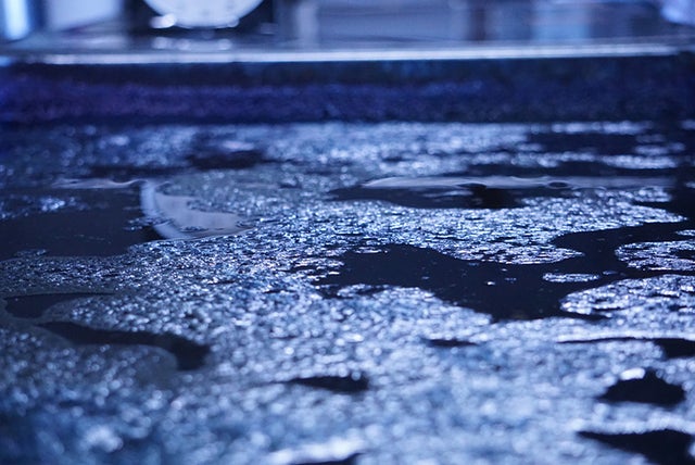 写真の泡が藍の華。藍は非常にデリケートで放っておくと機嫌を悪くします。その為職人は毎日藍の状態を確認します。葉藍や藍建ての時にも入れるのですが、どうしても機嫌が戻らない時に入れる物があります。それが日本酒。染液に異常が生じた時は日本酒を入れて機嫌を取ると調子を取り戻すそうです。これが藍は生き物と言われる由縁なのかもしれません。