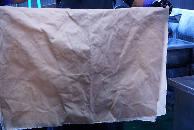 先ずは生地に付着している汚れや油分を水洗いして取り除きます。生地には特別な加工を施していませんが、日本の天然綿は非常に品質が良く油分が多い為加工をしていなくてもある程度の水は弾きます。