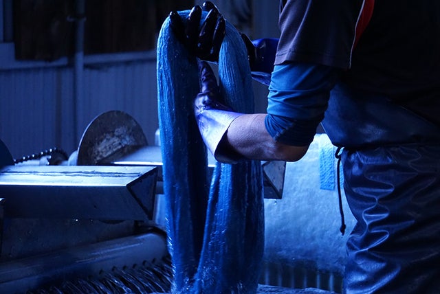 これが枷染め。藍甕の中に糸の束を浸し職人が手作業で絞っていき染めていきます。