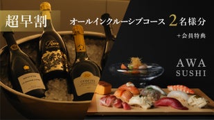 次回来店時に使える〈シャンパーニュ3種ペアリングチケット〉と、〈レストラン5%オフチケット(何度でも利用可)〉付きで、まずは気軽に「AWA SUSHI 泡鮨」を愉しみたい方に最適です。