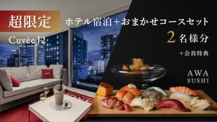 「Cuvée J2 Hôtel Osaka」での1泊2食付きペア宿泊券。夕食は「AWA SUSHI 泡鮨」のおまかせ鮨コース+シャンパーニュ1杯付き。