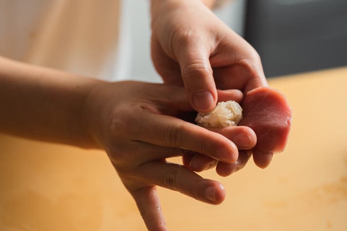 江戸前鮨のシャリと言えば、赤酢を使用した赤シャリ。「AWA SUSHI 泡鮨」でも赤シャリを提供しています。4~5種類の赤酢をブレンドして造るこだわりのシャリは、口の中に入れたときに柔らかい酢味に仕上げることで、どのシャンパーニュにも合うような工夫が凝らされています。