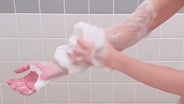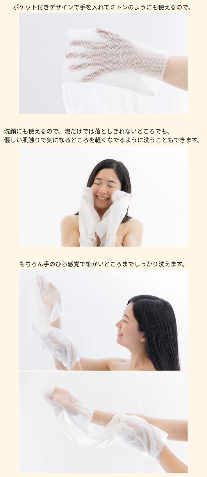 ミトン状の部分は、泡だけでは落としきれない気になるところでも、優しい肌触りで軽くなでるように洗うこともできます。