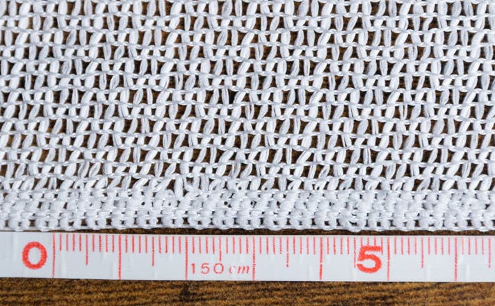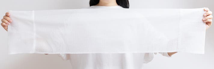 本製品は、形が安定しやすく、やわらかな風合いを実現できる「経編(ラッセル)」という編み方でつくられています。