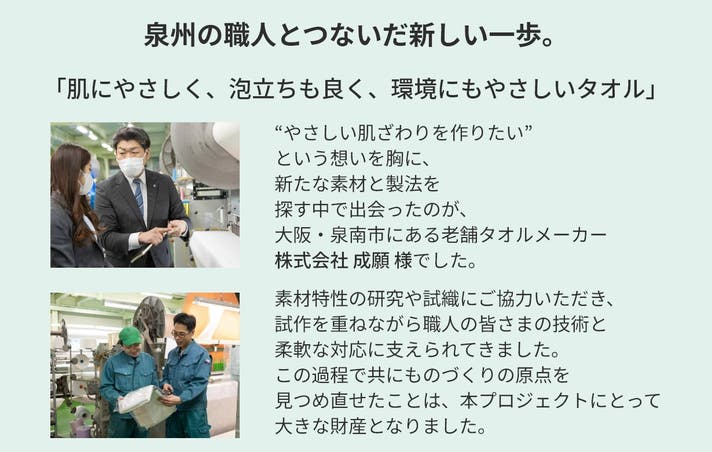 泡立ちや清潔さまで叶える素材を探して、ポリ乳酸繊維にたどり着きました。