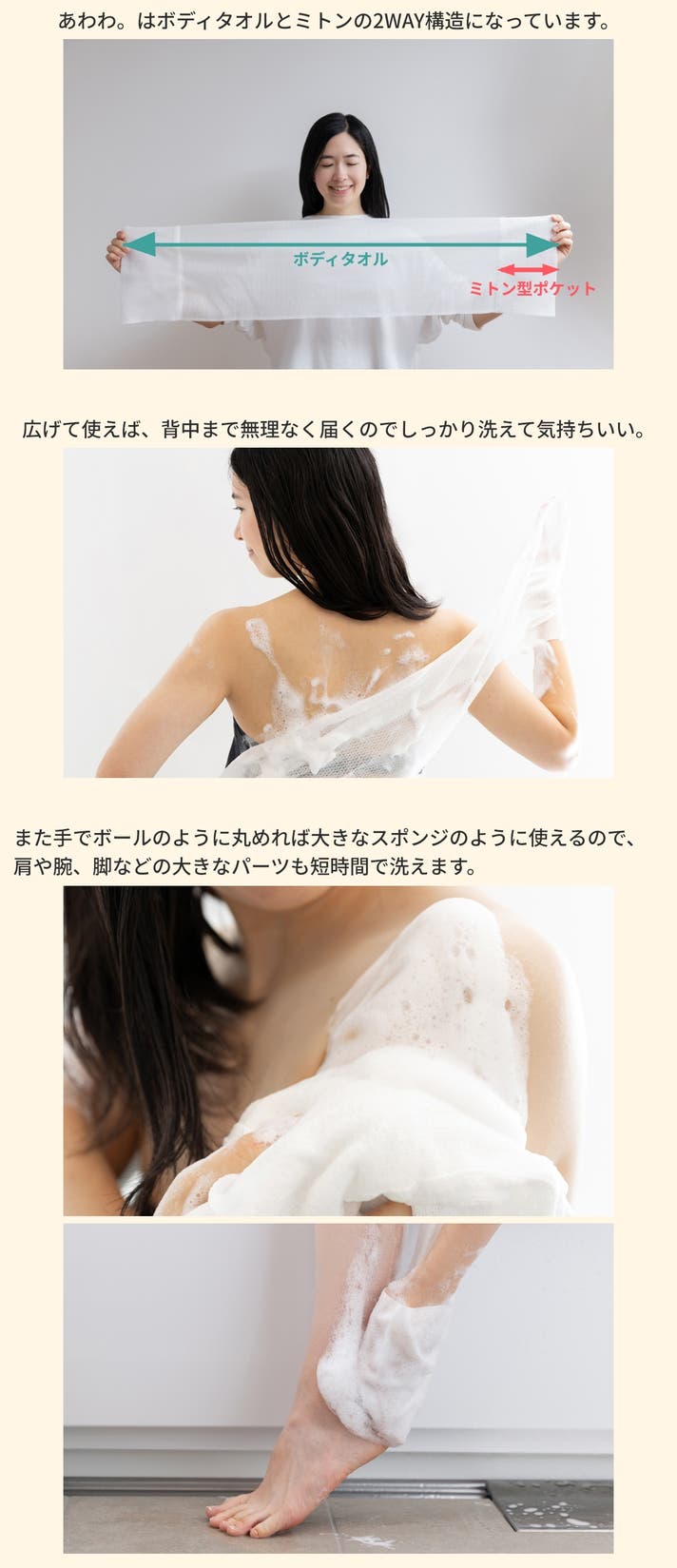 あわわ。は、全身をしっかり洗える全長100cmのロングサイズ。