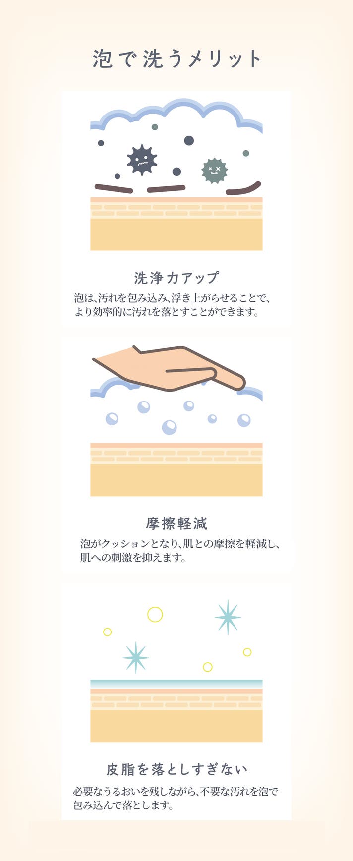 泡で洗うと摩擦が減る、刺激が少ない、でも清潔感はちゃんとある。