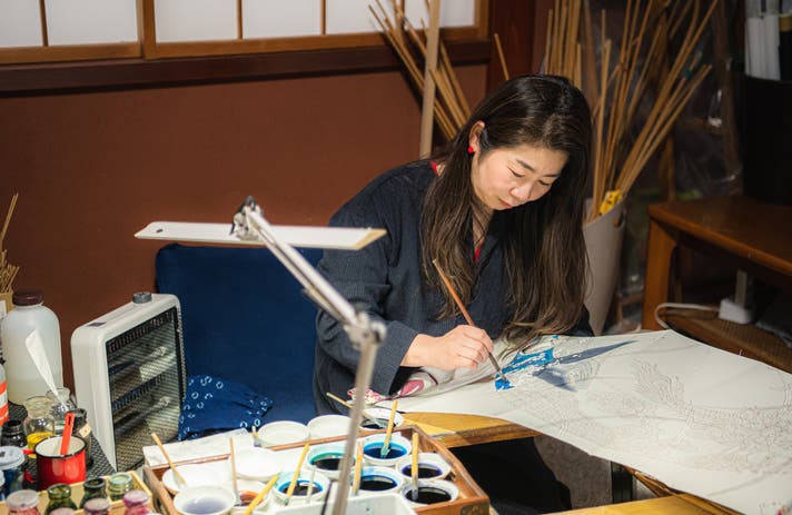 今回プリントに使用したのは、小松市在住の加賀友禅作家・一川さんが手がけた図案。一川さんの画風は、ぼかしを多用し、色のニュアンスを丁寧に重ねていくのが特徴です。その繊細な表現を損なわないように、何度もテストを繰り返し、色が潰れないように工夫しました。
