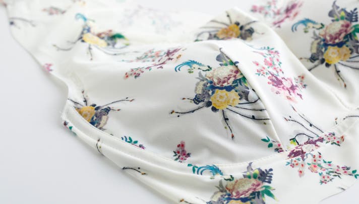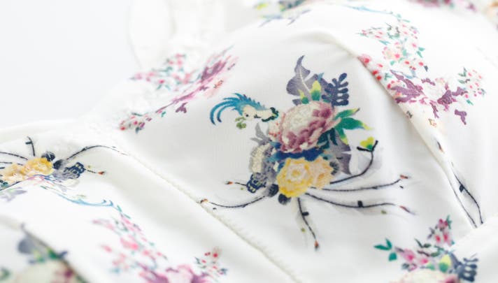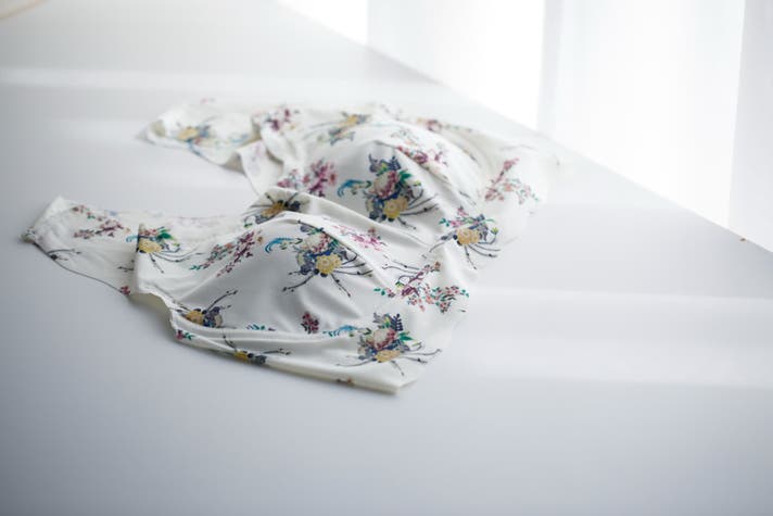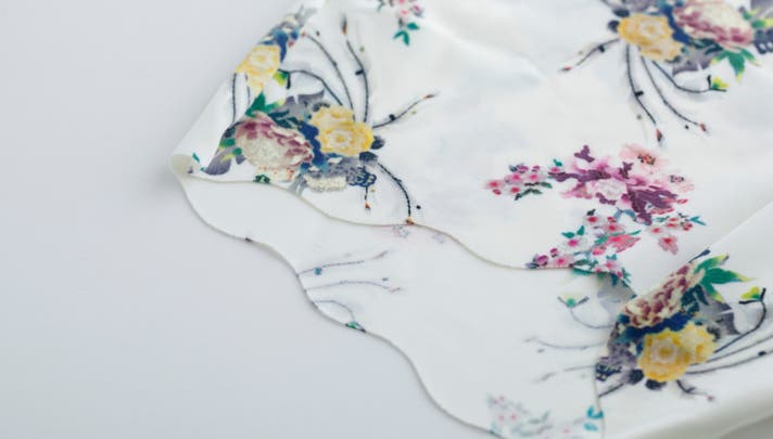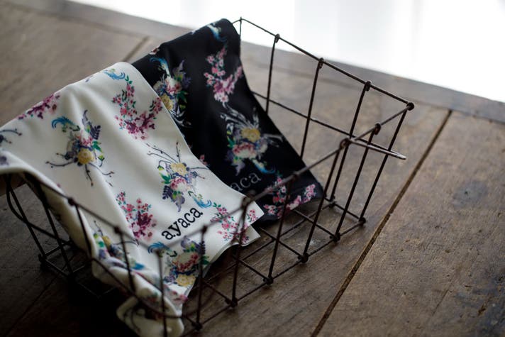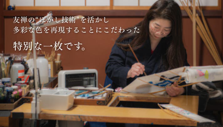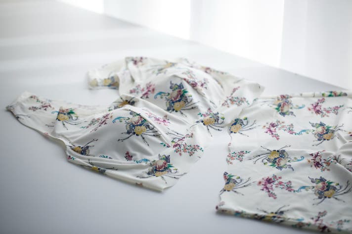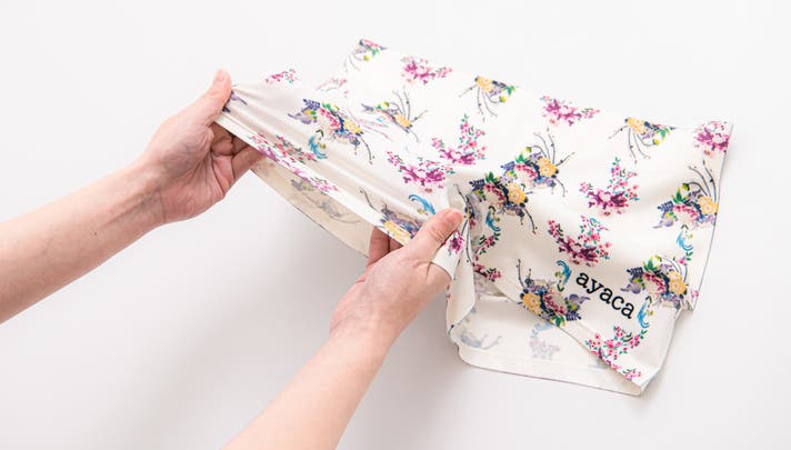 加賀友禅作家・一川さんの図案を採用し、国内の工場でプリント。色が潰れないようテストを重ね、ぼかしやニュアンスを忠実に再現。 縫製も含め、すべて日本国内で完結。日本のものづくり技術が詰まった製品です。