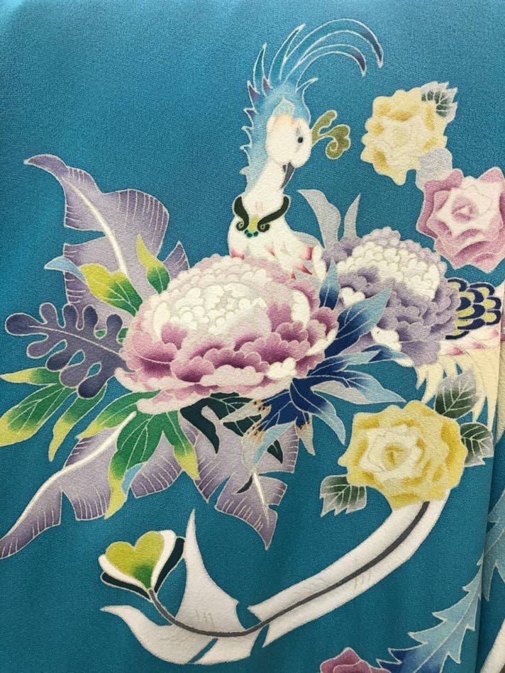 デザインモチーフとなった、加賀友禅の着物に描かれた鳳凰。淡く優しい色使い、自然の理を写実的に描く虫食いなどが加賀友禅の魅力。作家の一川さんの作品は淡いながらも印象に残る色合いと、多彩な色使いが特徴。プリント時にも細かな色合いが潰れないように何度も施策を重ねました。