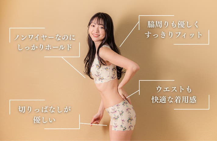 - ノンワイヤーで締め付け感ゼロ。敏感肌にもやさしい快適さ
