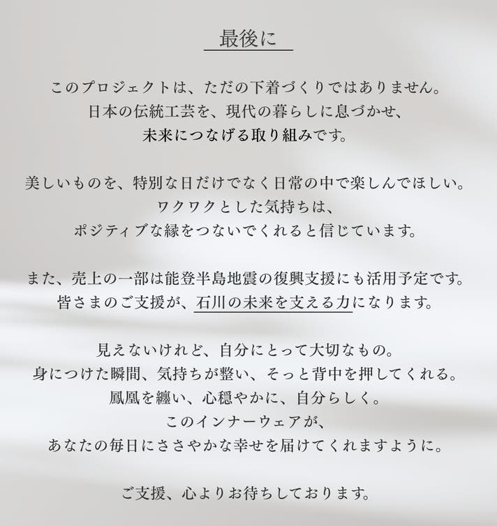 本文中に記載させていただいたスケジュールは、あくまでプロジェクト公開時点の予定です。 応援購入の性質上、配送遅延のおそれがございます。原則として、配送遅延に伴う応援購入のキャンセルはできませんが、リターン配送予定月から3ヶ月を超えた場合には、希望者に限りキャンセルにて対応させていただきます。 なお、商品は下着になりますので、キャンセルや返品・交換はお受けできません。ご了承くださいますようお願いいたします。