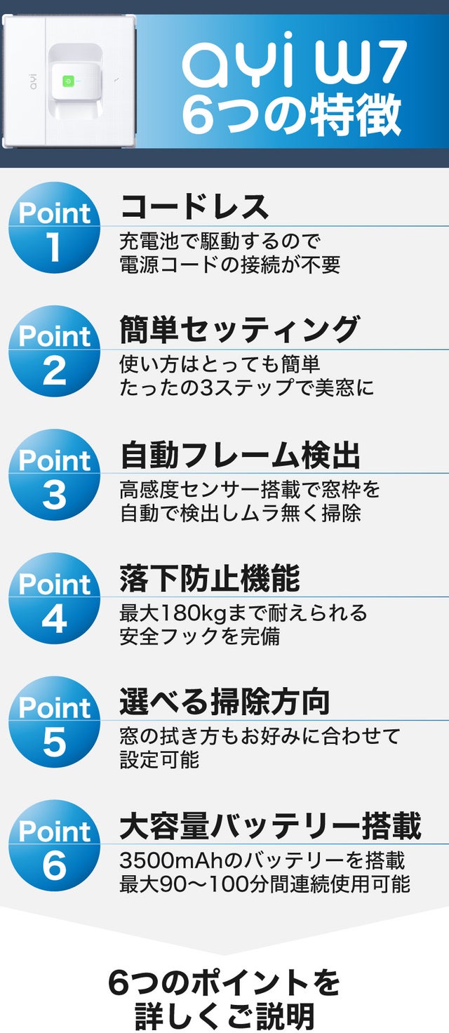 ayi W7はバッテリーを搭載しているため、今までの窓拭きロボットとは違い、電源コードを接続する必要がなくなりました。電源コードの接続が不要なので、落下防止の為の安全フックと絡まる心配がなく、より簡単に気軽にお使いいただけるようになっています。