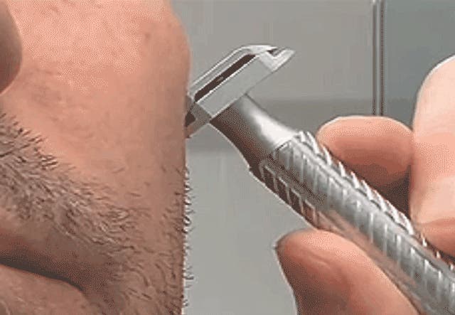 A: まずトップキャップ(上面)を肌に軽く当て、少しだけ起こすイメージで自然と肌に負担が少ない約30°になるよう設計されています。当てる力は極力軽く、重さに任せて滑らせるのがポイントです。シェービングクリームやソープを使って剃った後、乳液などで保湿をすることで肌の状態を最良に保つことができます。