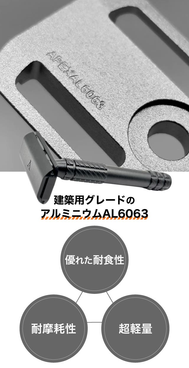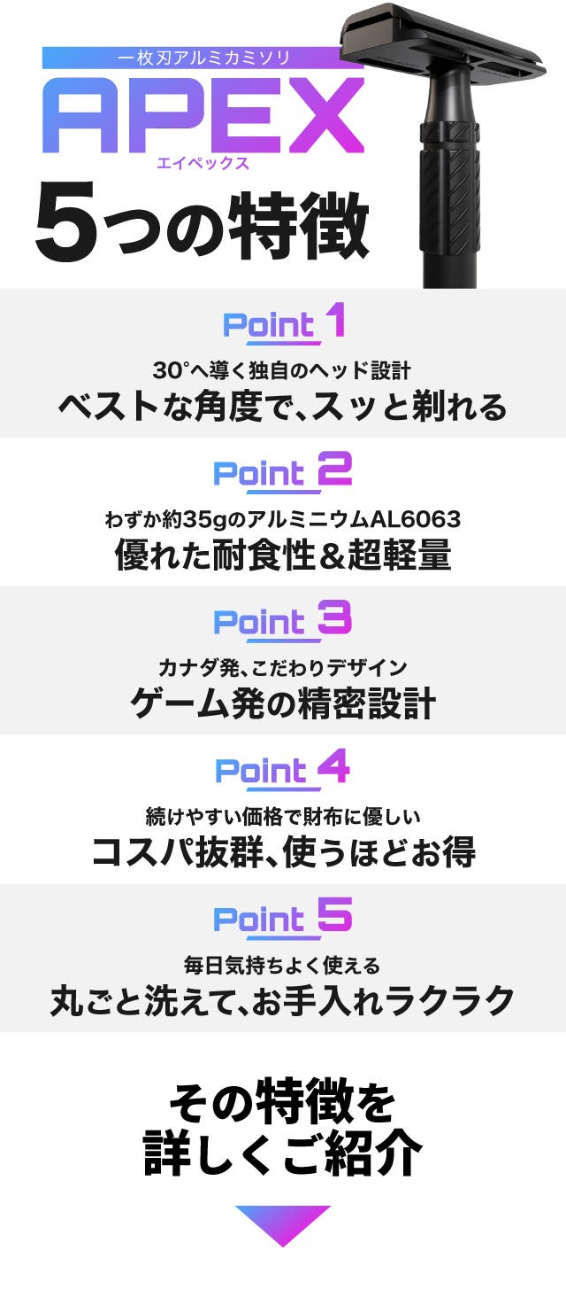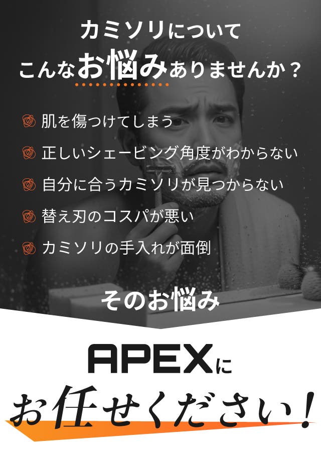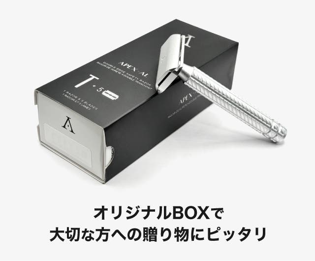 A: 一枚刃のカミソリは怖いイメージがありますが、APEXシリーズは初心者の方でも手軽に使える設計になっています。 最適な角度(30°)に導くヘッド設計により、迷わず扱えるようになります。 刃の露出を最小限に抑え、肌を傷つけづらい構造のため、海外のお客様からは「肌荒れもしにくく、深剃りできる」という声も多くいただいています。