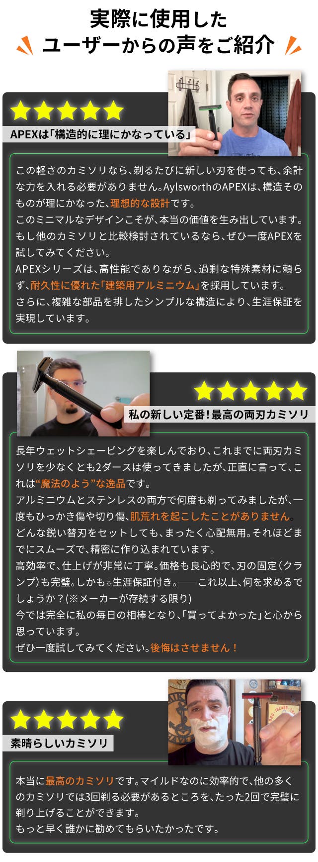 『Aylsworth RazorsのAPEXを日本にお届けできるこの機会に、心から感謝しています。 精密さ、シンプルさ、そして(モノへの)敬意を兼ね備えた日本のデザイン精神は、私たち自身のデザイン哲学においても、大きなインスピレーションの源となってきました。『考え抜かれたデザイン』と『時代を超越した品質』の価値を理解してくださる日本のお客様と、私たちの製品を分かち合えることを、大変光栄に思います。』