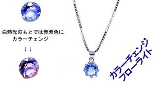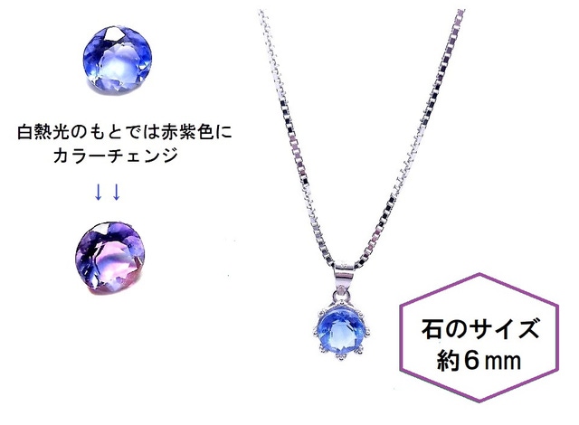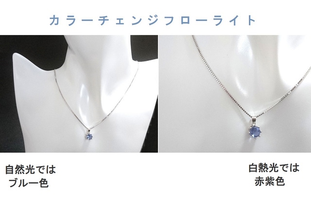 自然光のもとでは鮮やかなブルー色が、白熱光のもとでは赤紫色にカラーチェンジします