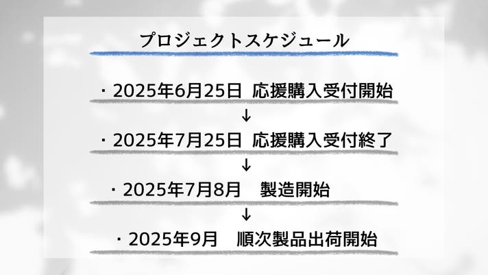 このプロジェクトはAll in型です。目標金額の達成に関わらず、プロジェクト終了日の2025年07月25日までに支払いを完了した時点で購入が成立します。