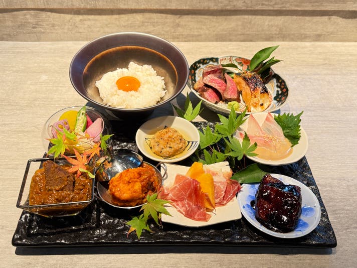 このランチは、シェフ自身が「心から嬉しいと思える料理」をふんだんに詰め込んだランチプレートに、炊き立てのご飯、旬の焼き魚をご用意いたします。