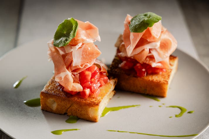 生ハムスライサーの最高峰ベルケルのマシンでスライスしたふわふわの生ハムとフルーツトマトのブルスケッタ