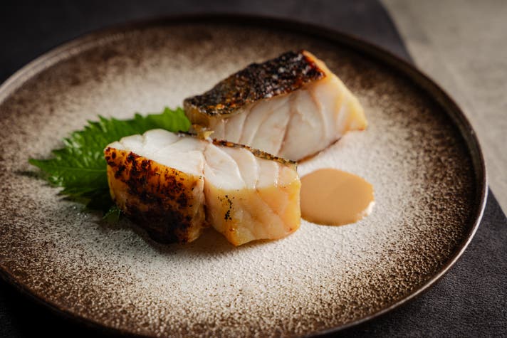 九州より取り寄せるクエの西京焼き〜ナッツと西京味噌を合わせたソースで漬け込んで炭火で焼き上げる麻布料理店の人気メニューの一つ