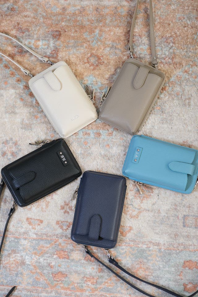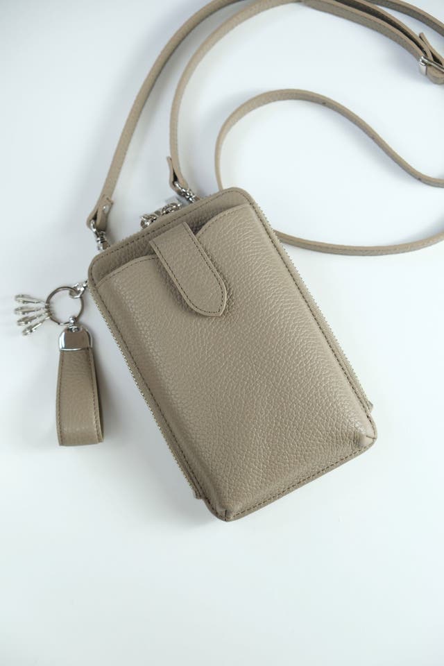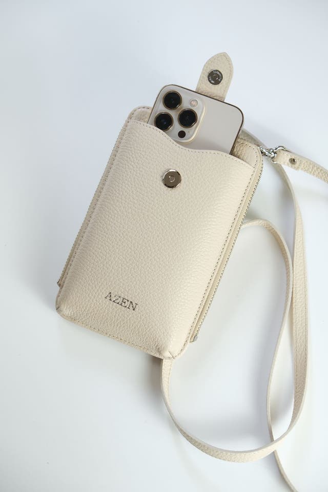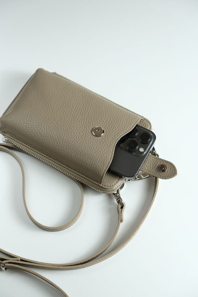 イタリア製本革を使用した、オリジナルのスマホ入れポシェット