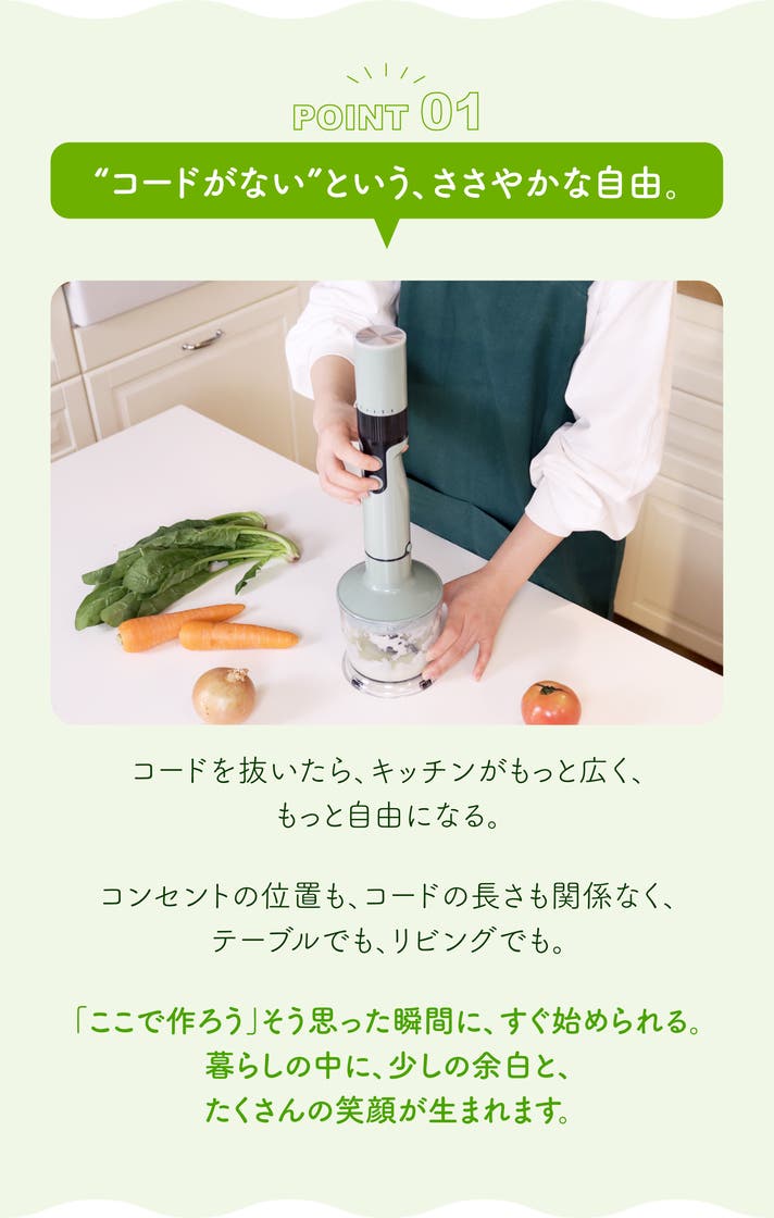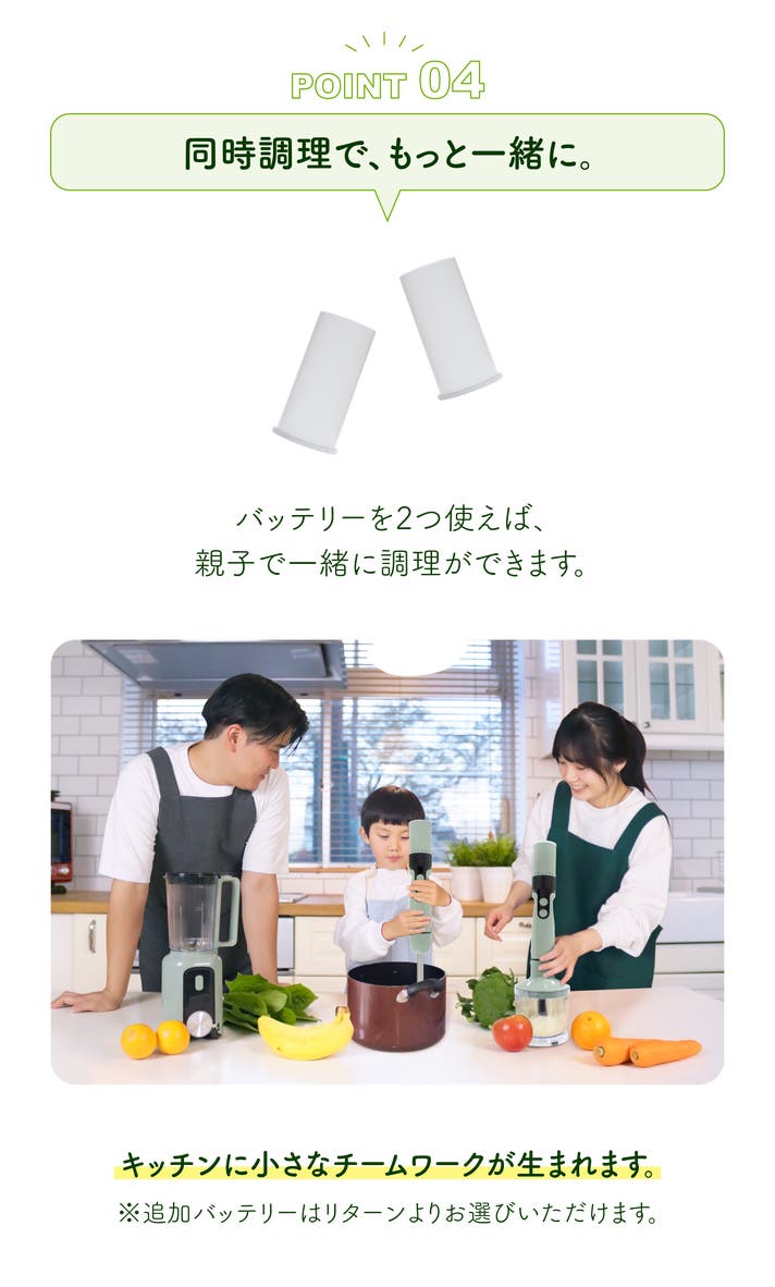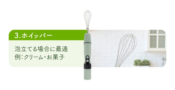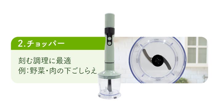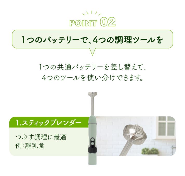 - 【4in1】1つのバッテリーで4機能(スティックブレンダー、チョッパー、ホイッパー、ミキサー)