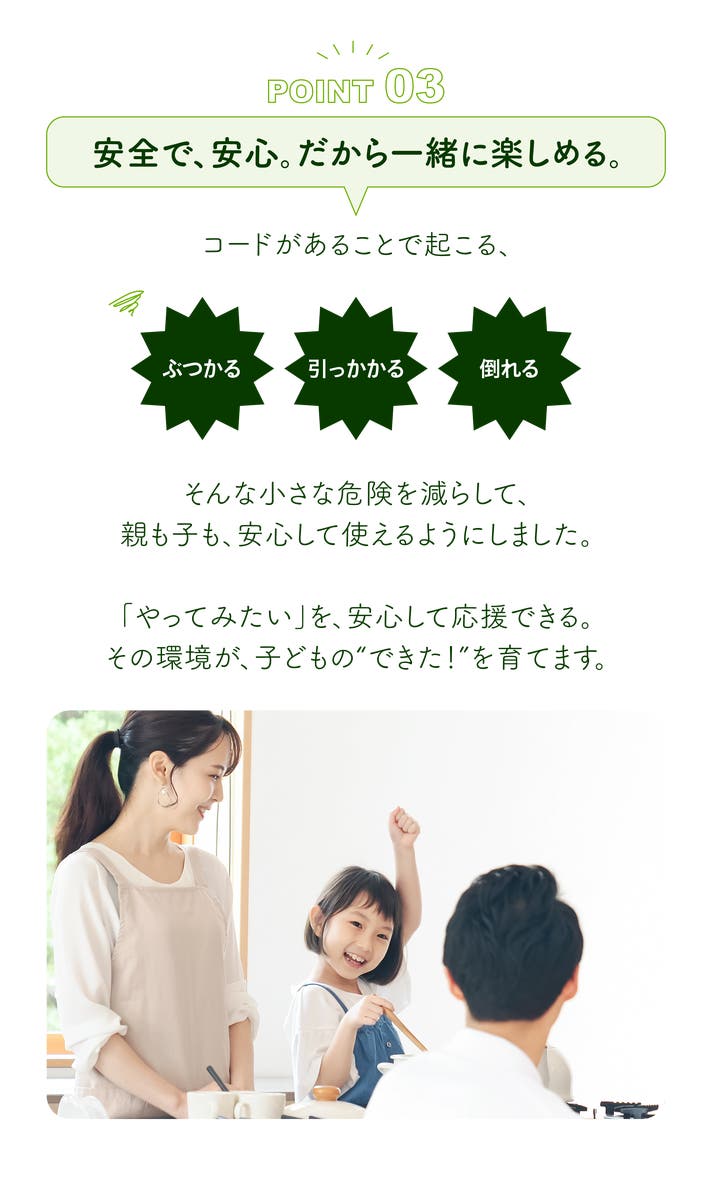 - 【どこでも】キッチンの場所を選ばず、快適に調理可能。コンセントの位置を気にせず自由に使える