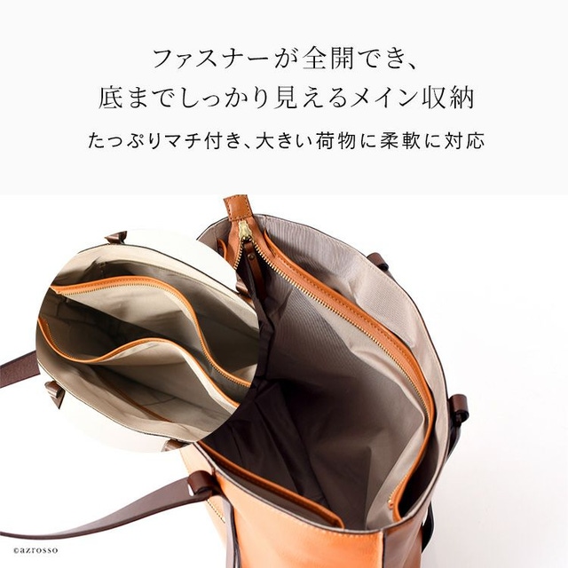 左右の収納にはさらに、ファスナータイプとオープンタイプのポケットがついているので取り出しやすく、女性の持ち物を考えて作られた収納上手なバッグです。