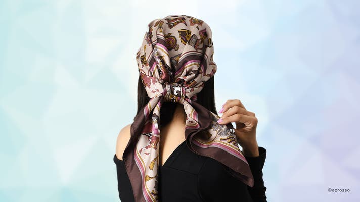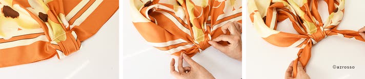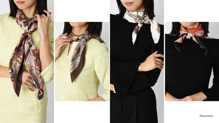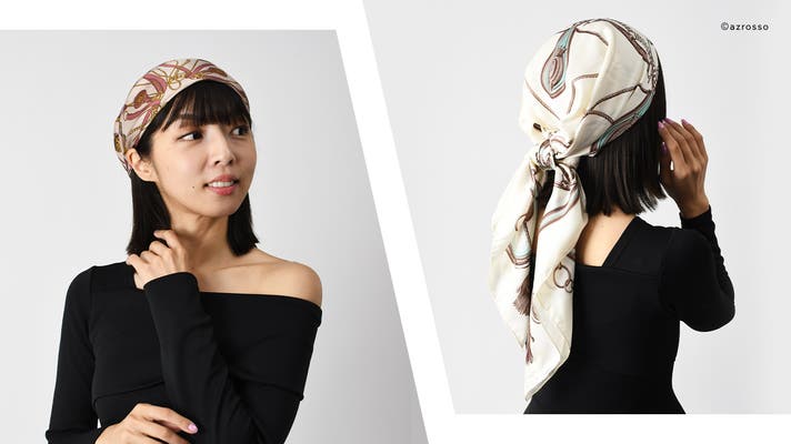 ▼スカーフを首に巻くアレンジ例|ヘッドスカーフと同じくらい簡単に身に着けていただけます。