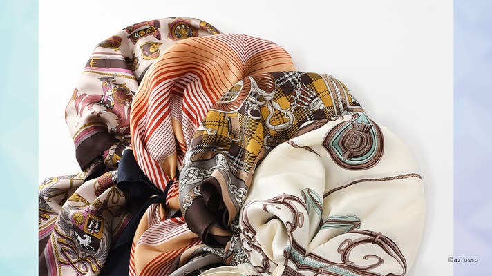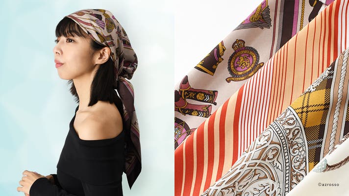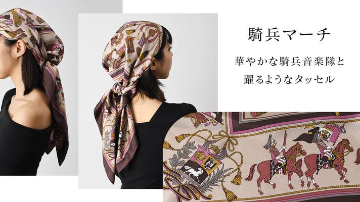 シルクの光沢と美しい柄で、自然と顔まわりが華やぎます。