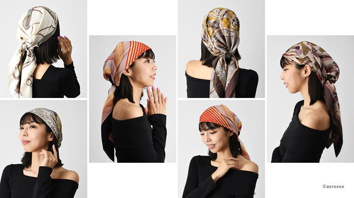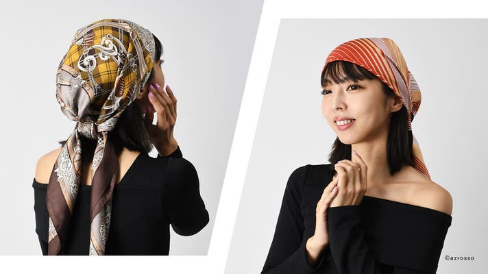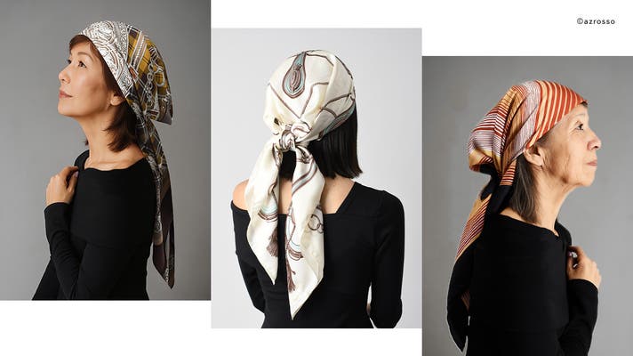 そんな思いで作られたこのスカーフは、ウィッグや帽子が欠かせない日々でもおしゃれを諦めない方の強い味方。